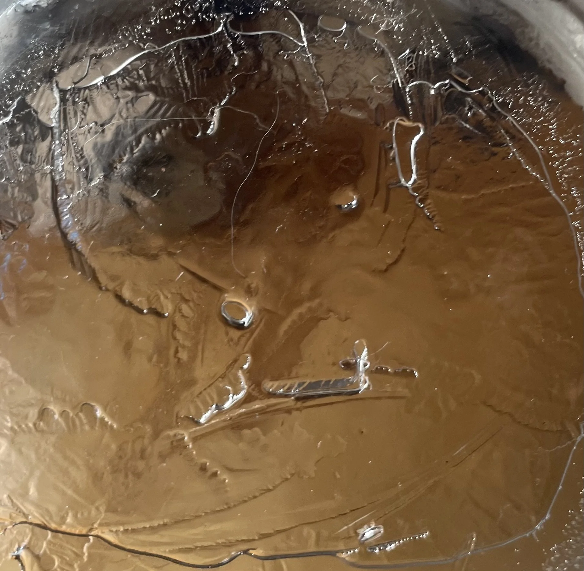 Tucked away amid dense native bush is a hidden, beautiful ‘Secret Garden’, with its own lily-filled pond, for yet more quiet reflection. The water freeze mirrors this, a single star amid the reeds at the top, just below 12 O ‘Clock, and on the left hand dish edge, a very serious Being in meditative reflection, either that or the pond Guardian taking its responsibility very seriously.